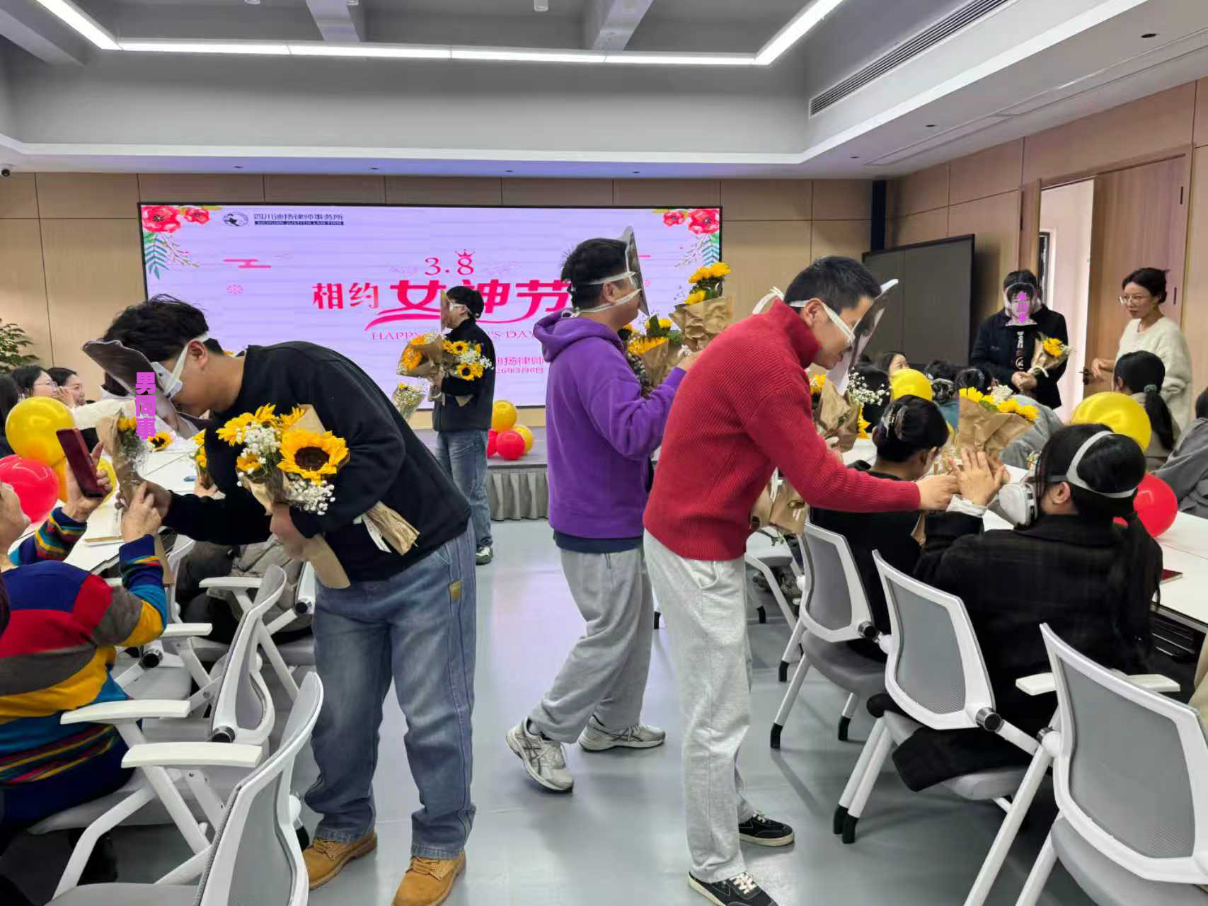 趣味活动·暖一份心意 党建学习结束后,由律所男员工化身“神秘祝福使者”,手捧鲜艳的节日祝福花束,以幽默诙谐又温情满满的方式,为律所女员工送上祝福。